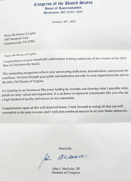 Nancy B’s is conveniently located on Route 29 North, next to Grand Home Furnishings & across the road from IHOP, within easy access from Rio Road, Downtown Charlottesville, and Ruckersville. Whether you’re looking for a single light fixture or lighting for your entire home, we invite you to enjoy the benefits of a locally-owned business.